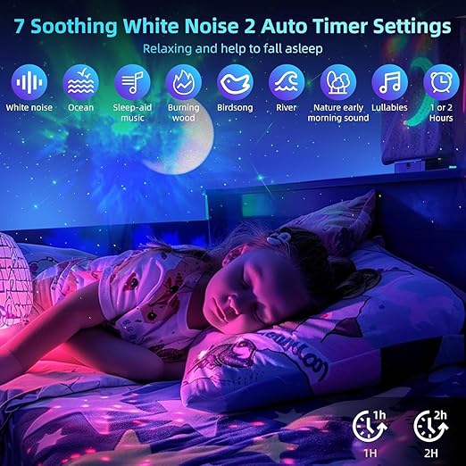 - Moon & Multicolor Nebula: Projects beautiful moon phases and colorful nebula patterns across walls and ceiling